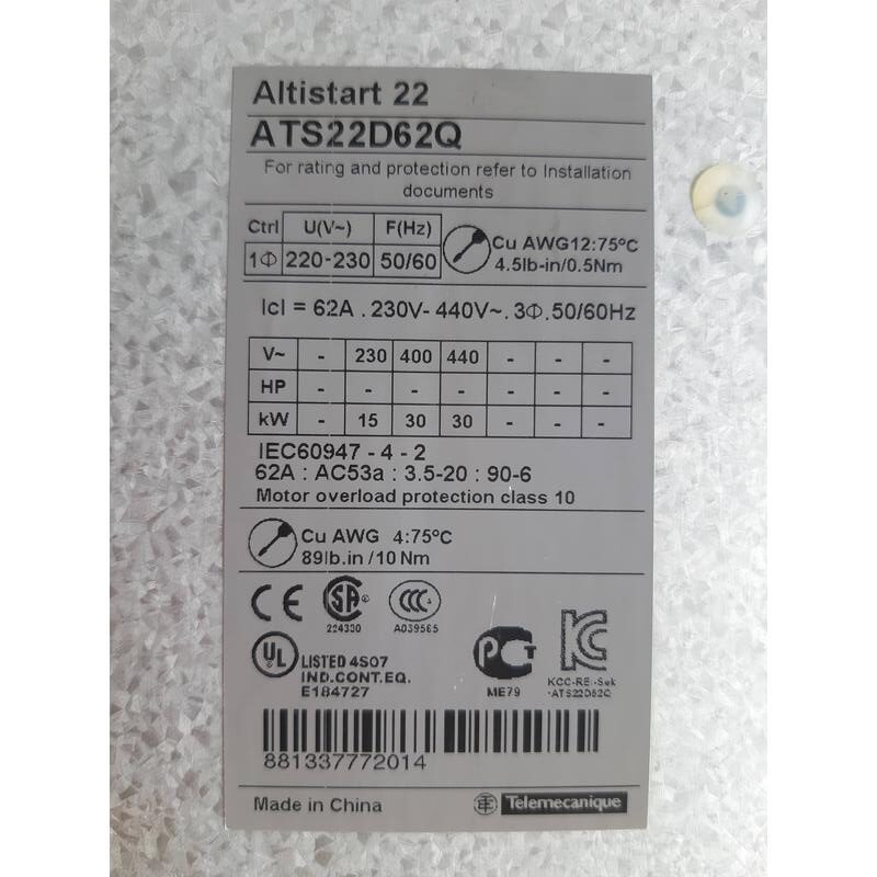 SCHNEIDER ALTISTART 22 SOFT STARTER ATS22D62Q